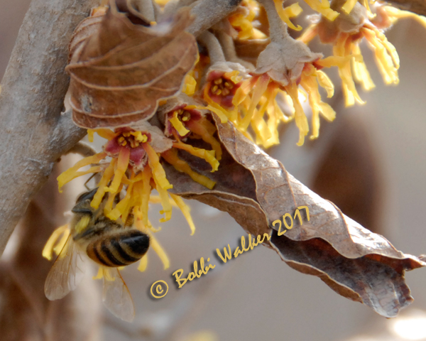For your viewing pleasure: honeybees on the witchhazel bushes (Hamamelis vernalis) in February.