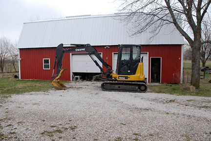 | I had been wanting to get this done since the day we took possession of the farm... fix the garage drainage problem. You see, for some unfathomable reason, the previous owner (a General Contractor, no less) built the gambrel "barn" garage in a low spot. The land on all but the south side slopes TOWARD the building which means water makes it's way inside during every heavy rain. All things metal rust, all things cloth mold, all things wood rot in a too moist atmosphere. Yes, we knew about it before we bought the place... I've said it before: nothing beats 20 acres adjacent (in reference to the pro/con list of our decision making process) and the hubby was sure he could fix the problem. To his credit, the hubby DID make an effort by digging along the west side of the building; creating a flat/slight slope away from it of about 3 feet wide. Unfortunately, because the rest of the area was a couple of feet higher, that flat area still got very wet and it was difficult to mow the resulting steep hill. Then he dug a little ditch from the north side of the garage through the field to help move THAT water away; which caused more runoff going toward the road and that is not a good thing. (Not to mention how annoying it is to mow across that ditch, ugh.) For all his good points, the hubby hasn't got a firm grasp on moving water without simply moving the problem... most people have this same issue, so he is in good company. What we needed for the garage was french drains... quick description is this: picture a moat around a castle (leave out the water for our purpose), put a base of course gravel at the bottom, then extend a tube the distance of the moat with lots of holes piercing it (and open weave fabric around it to minimize dirt getting into it), cover that with a layer of soil, another layer of course gravel and then top it off with soil (be careful not to compact it) or (where you need to drive into the building) medium-grade gravel. The non-compacted soil and gravel allows large amounts of water to infiltrate deep into the ground instead of running off to the most convenient gathering spot... in our case the interior of the garage. Now, picture that gravel/tube/gravel-filled moat  created with a bit of slope going in a particular direction to move that  water where you want it to go and, once away from the building, change out a solid tube for the pierced tube to where  you want it to emerge from the ground... that is called a "drain to daylight". Most of the water soaks into the ground before it gets to that solid tube, BUT if the amount of water is SO much that it even overwhelms the infiltration capability of the gravel, that excess water exits by way of the drain to daylight. The years I spent studying sustainable building helped me to understand how difficult water problems can be and why finding a professional who knows what they are doing is SO important. The repairs on the house had to take priority when we did find money to invest in repairs. Therefore, the garage was at the bottom of the list and while we gritted and ground our teeth  dealing with rusting tools, moldy cloth, etc. we knew we had to bear it until we got the other things done. The other side of our dilemna was finding a contractor who would work on our project. We needed someone who understood about water run-off, moving dirt and working in close proximity to an exisiting building. Over the last 10 years, I have asked for references from every farmer I've met, every business that has done work here, the propane folks (they know EVERYBODY), the MFA... you name it, I've asked. If the recommended person/business was familiar with water runoff, they didn't want to deal with the building; if they were good with moving dirt, they didn't want to deal with the building... gee, a pattern arises. No one wanted to take a chance of damaging the building... can't really blame them for that. Then, at the 2016 November Election, I was subbing at one of the Odessa Poling Places and the Election Judge I was partnered with (she knew EVERYBODY) introduced me to a lovely woman whose family does construction. My Pavlovian reaction was to ask if she knew anyone who could put french drains around an existing building. Sure, was her answer, my nephew does that. My jaw fell to the floor. She gave me his name and phone number and I am so thankful for her (and the woman who introduced us!). Of course, I was nervous to approach him. I'd been burned before after each contractor saw what we needed. So, I put off contacting him and besides there was no money at that moment. Then the **it hit the fan with my aging parents (read all about that here) and my time was required elsewhere. Enter the "we can't put this off any longer" panic of the north porch and siding on the house. We had to come up with a way to pay for these necessary repairs. When I found the money to replace the north porch (click here for the porch story) and  re-siding/painting  the house (click here for the siding/painting story), I discovered we might just end up with enough to cover the garage as well (or at least I was hoping to) and so I gathered my courage and called the nephew who does excavation: Robby Hotmer. He was very nice and after I described what we needed, he thought he could help us. So,  almost a year after getting the recommendation  he came out and gave us a quote for the job. An actual quote! He did not seem nervous in the least to work around the building. YIPPEE. He was booked until Spring, but that was just fine because I was overseeing the porch and then the siding. So it was March 30th when he and his associate came out to do the job. And what a FINE JOB they did! |