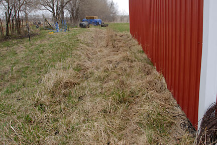 |  | Same technique used on the west side. Note that much of the soil has been removed on the west side already. There are pictures later of where it went. The guys were nice enough to alter the hill on that side so we would be able to mow there more easily. |