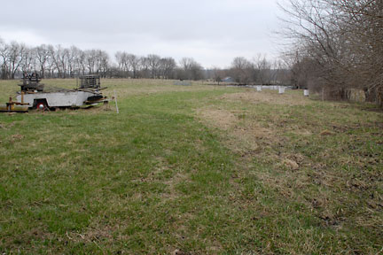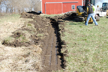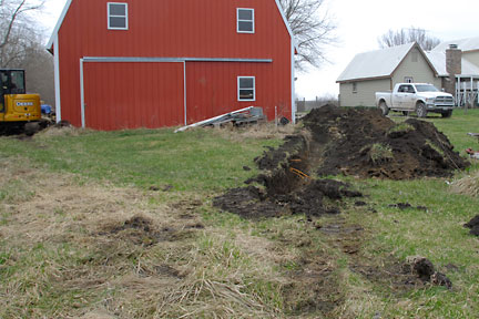 |  | Here is the ditch from the east extending to the south where the two (2) ditches will joing for the drain to daylight. The ditch is shallower here because the land slopes more here than the ditch does. You can see the digger on the west side. |