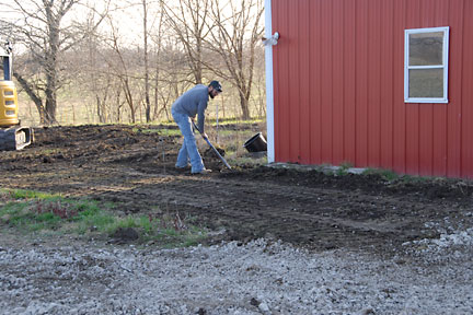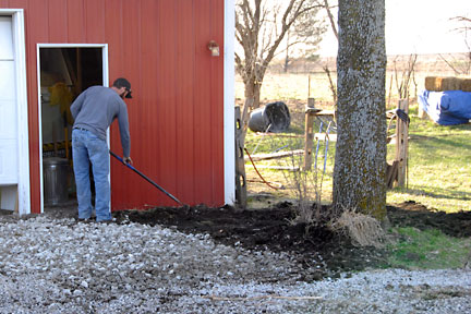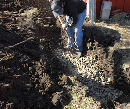 |  | Using the hand shovel to smooth out the gravel.  They put all the gravel in place before putting the soil over the top of it. |