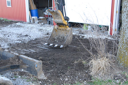 |  | After the ditch was filled, they guys used the claw of the digger to load the earth mover (in those confined areas) for transport to where I wanted it. |