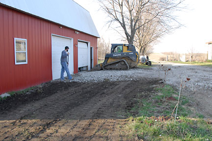 |  | The earth mover is finishing up moving the leftover gravel around the driveway and leaving a nice smooth surface as well. The assistant is using a rake to fine tune the clean up. Notice that the soil is not compacted over the ditch next to garage. The tire tracks show where they moved to and from. Yes, that area will need seeding in the spring. Now worries. The decorative stakes mark the peonies I did not want disturbed. They weren't even bumped. |