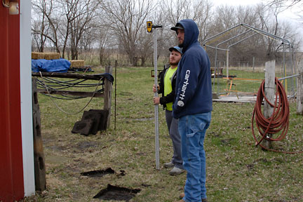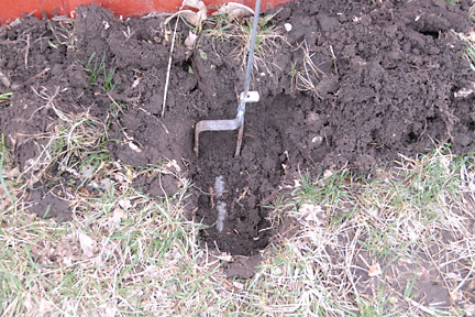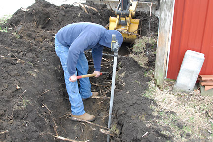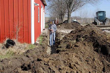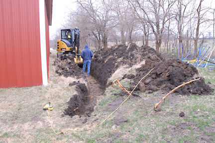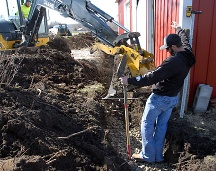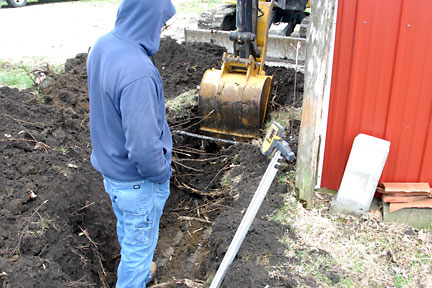 |  | The assistant checked the depth often (the measuring stick part of the laser level is directly in front of his head in this pic). He used a hand shovel to remove the dirt from under the electric line and also to cut any roots that were problematic. |