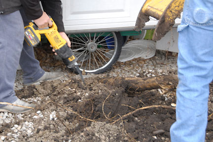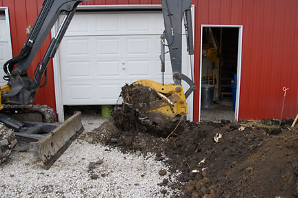 |  | It was kind of scary watching them start right by that tree and the electric line. But there was no need to worry.  I'd forgotten to think about what would happen to that tree. Look at all the roots that go TOWARD the garage. It was surprise to me but in hindsight it shouldn't have been. You can also see the exposed gray tube. The digger was used to take soil away from either side but what was underneath was removed by hand. |