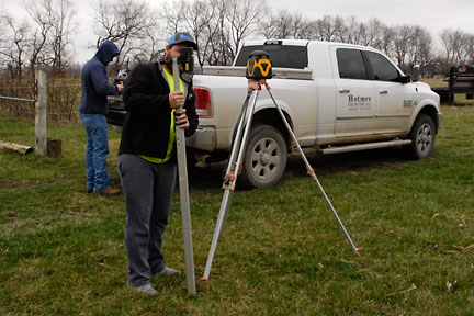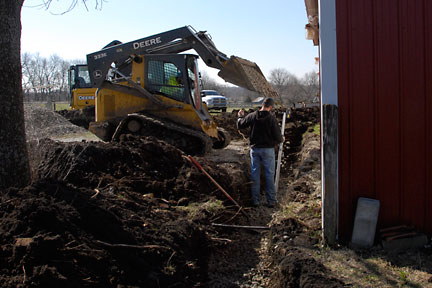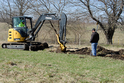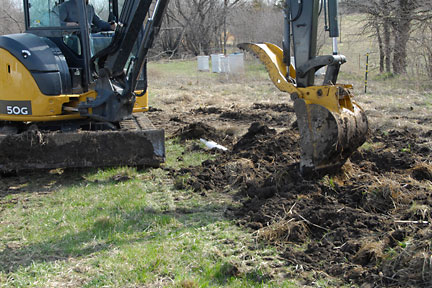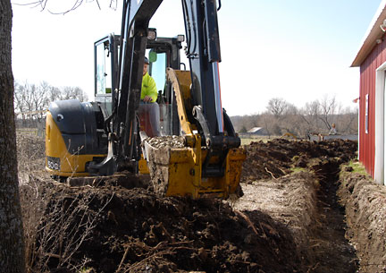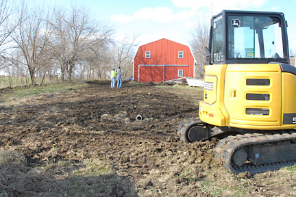 |  | Here you see the earth mover pushing the soil into the ditch (most of which is already done). They were great about getting it down to where the grass was growing without damaging the grass very much. |
