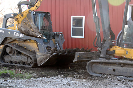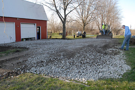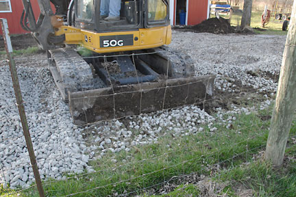 |  | Use the appropriate tool for the job at hand.  In the driveway, there would be NO soil put in above the course gravel and they did not need the reach of the digger, so they could use the earth mover that dispenses a larger quantity of gravel at a time.   |