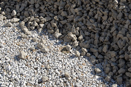 |  | This picture shows the difference between the gravel already on our driveway and the course gravel going into the ditch. Normally, they would have preferred the same size as we use on the driveway, but it was not available and bigger is better than smaller when it comes to draining water. Because they knew this before they started digging, they separated our driveway gravel that was removed and used it on top of the bigger gravel in front of the garage doors. |