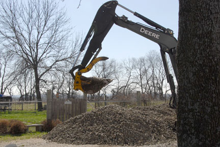 |  | The north end of the east side was the last to be filled back in with soil because of the tree. They had to use the same care as they did with the gravel. |