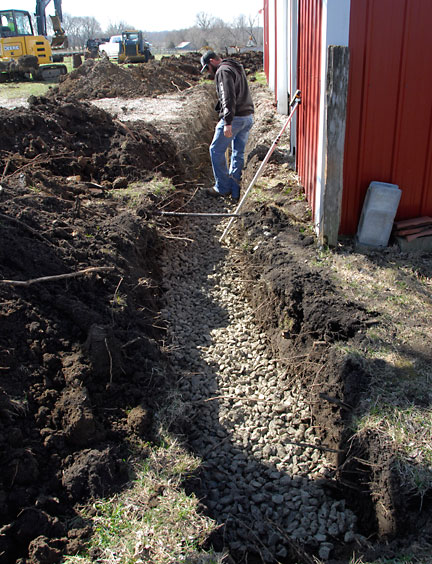 |  | The claw of the digger getting gravel to fill in after the tubing has been laid and a bit of soil put on top to cushion it from the sharp edged gravel. |
