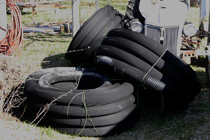 |  | It is difficult to get a good picture of black stuff on a bright sunny day.  This is the pierced tubing with the net material around it that goes in the ditch over  the course gravel and a bit of soil which cushions the tube from the gravel. |