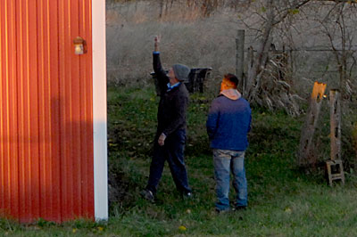|  | It was not quite dark when  they finished cleaning up and headed out. We sent them away with a 1-pound jar (each)  of our honey. They were pleased and surprised to get it. Obviously, I took lots of  pictures (having gotten permission first). These men worked like a well-oiled  machine. They appeared to really enjoy their work and they were really good at  it. It was a pleasure to watch them. After waiting for SO LONG, it was almost a  shock that they finished the job in a single day!  Below are the (left) Before and (right) After photos.  I never liked the 'embellishments' of the fake hay loft door, fake barn door and fake shutters on the ground floor windows. I am SO happy to have them removed. |