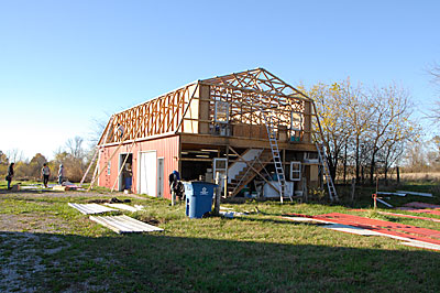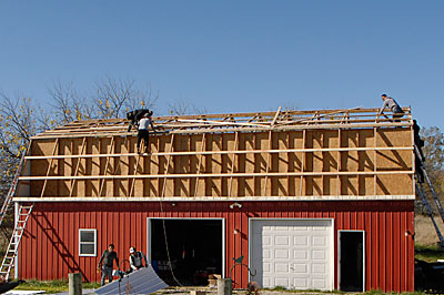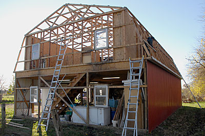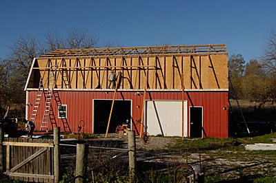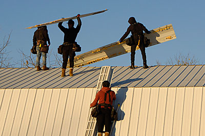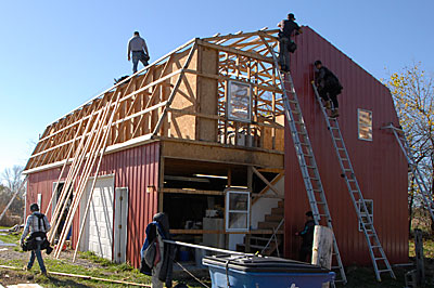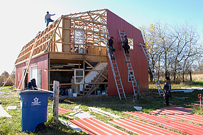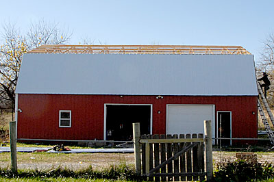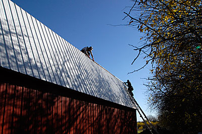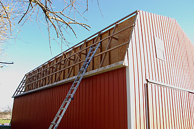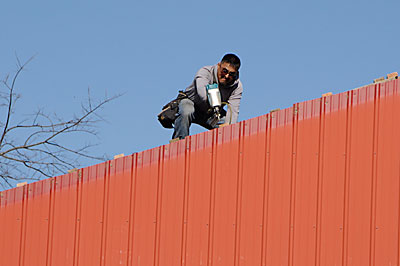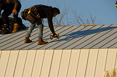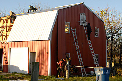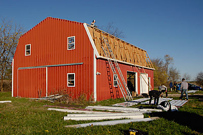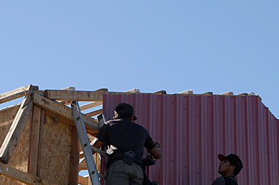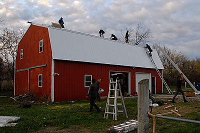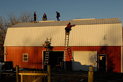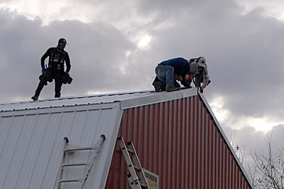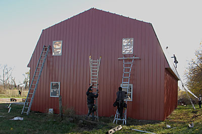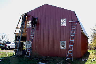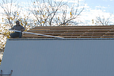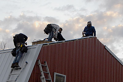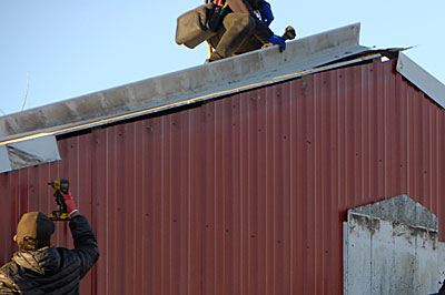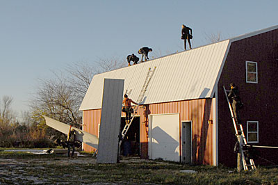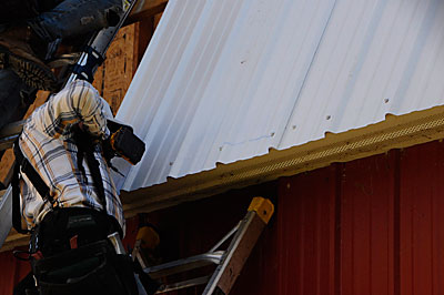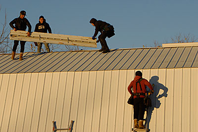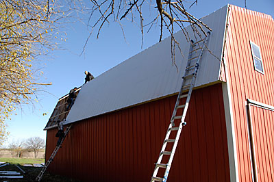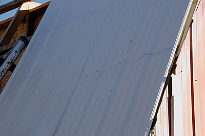 |  | In the photo above right (and at left), you can see that the crew made measurements first and then cut the panels while on the ground before raising them into place. The precise measurement and cutting really impresses me. Each panel on the north wall is a single length.  No panels were bent and great care was taken throughout resulting in NO DAMAGE during the installation. |