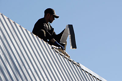 |  | Before the shallow slope panels could be installed, a form-fitting foam insulator was attached along the top edge of the steep slope panels and then flashing was attached over the foam. The foam helps keep water (and air) from being blown  under the flashing and shallow slope panels. The same application is applied at each side of the peak of the shallow slope and finished with the ridge cap. Once completely insulated and capped/trimmed, the result is a water-tight roof. |
