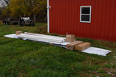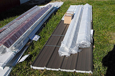 |  | The corrected Bright White roof panels and corresponding bits were delivered on  Friday, the 15th and the job was scheduled to begin on the following  Monday (November 18). Hubby reminded them that they would be adding the purlins and was told  the crew would bring them with them. |