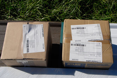 |  | Finally, in early November, Hubby (and by extension, me) was  told that the metal panels et al would be delivered on November 7th.  They were delivered and I was home at the time. As the delivery guy was  leaving, I took photos of the labels and discovered that EVERYTHING was for RED  panels. Only a few corner and window trims were white. I panicked! First I  double checked that the contract was clear about Bright White on the roof and  Patriot Red on the wall. As soon as Hubby was available, he also took photos and  sent them in a text to the company. OOPS, Charles had sent in the order wrong. There was  an apology and promise to get the order done correctly with a RUSH added to it. |