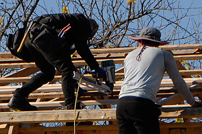 |  | The steep slope of the roof was completely paneled before moving on to the shallow slope. You can see in the following photos how the crew measured and used a chalk line to mark where each panel was then cut while on the ground before being taken up for placement. One panel at a time was done so that the edges would align perfectly. They also marked the location of each purlin (from the bottom edge). Every screw went into a board.   |