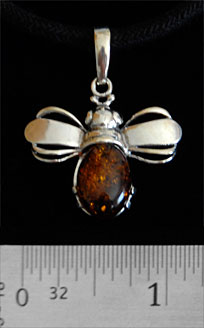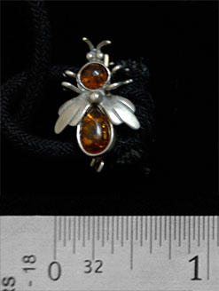 This stylized bee in flight is a lovely accent pin made entirely of silver with amber as the thorax. |
