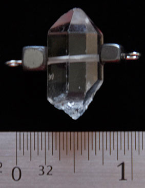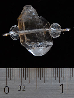 Not so clear quartz single points have dark inclusions of unknown minerals and are flanked by sparkling glass beads.