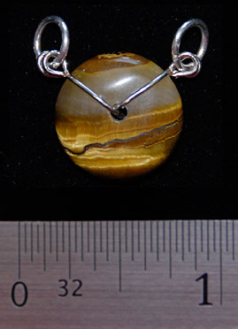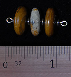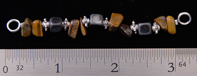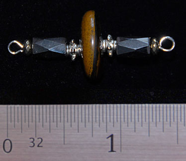 A tigers eye ‘disc’ flanked by magnetite, silver-colored spacers and pyrite beads.