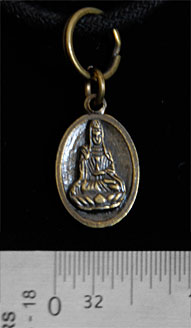 This oval, bronze colored charm shows her seated on a lotus blossom with her left hand under her heart holding a jar of water (devine nectar of life, compassion and wisdom) and her right hand raised holding a willow branch to sprinkle the water as a blessing. Willow is a symbol of adaptability because it bends without breaking.