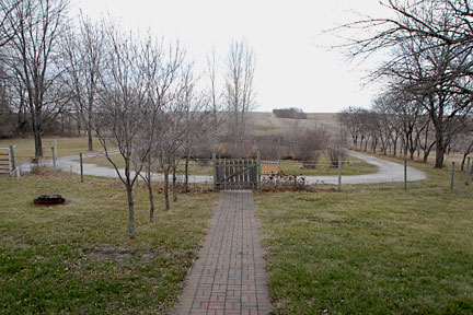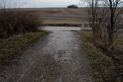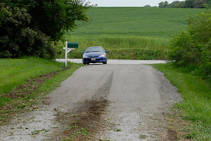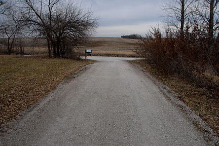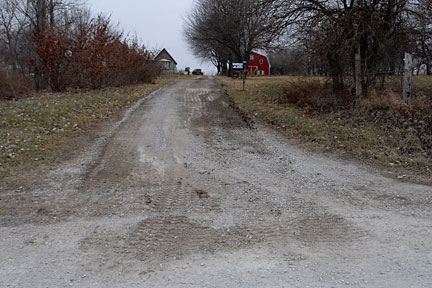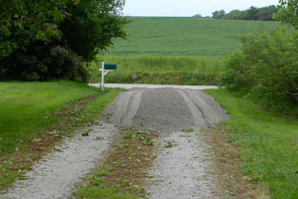 |  | The main driveway from the other direction. The culvert is in the lower right segment of the picture but not really seeable. Most of the time, we pull out of either driveway and head west (up the hill). Conversely, mostly we approach the property from the west (down hill) and are turning right into the driveway. Therefore, the pitch east-to-west of the driveway makes that turn easier (a bit higher on the outside of the turn and lower on the inside of the turn -- if I'm being clear, I hope so). |