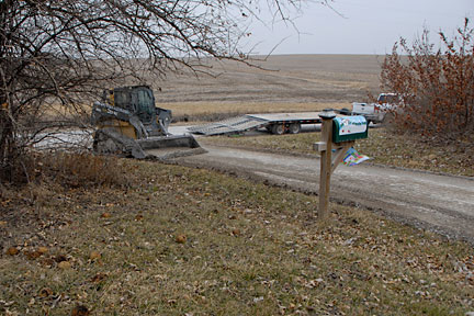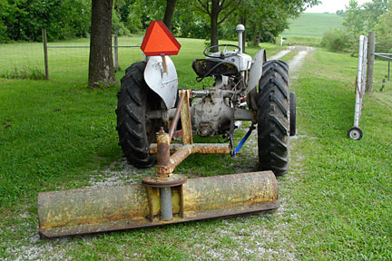 |  | Here you see the tractor with the blade attachment all ready for the hubby to spread the gravel over the width of the driveway.  Unfortunately, we ended up having to ask a neighbor who does 'flat work' to do that for us.  I had hoped he would reduce the 'bump', but he didn't and that has been an annoyance for me ever since. |