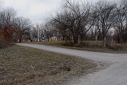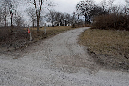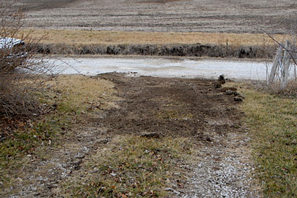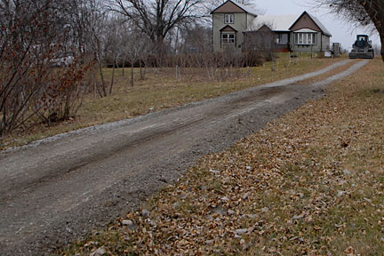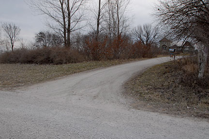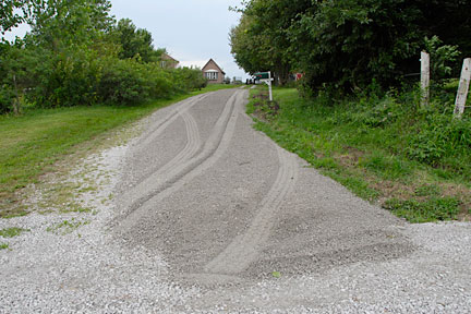 |  | A close-up of the circle exit/road transition (from the main driveway). You might also see the culvert for this driveway in the middle of the right side of the image below the gravel and some grass. There is a small ditch created by the water running along the road through the culverts. |