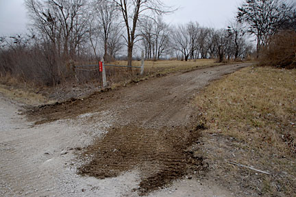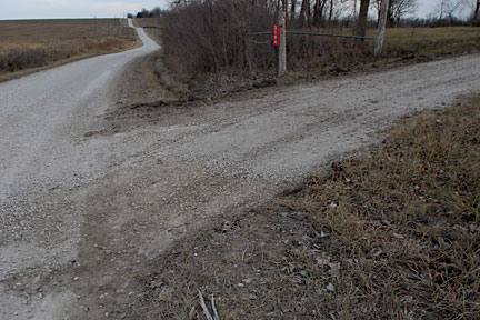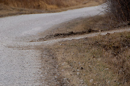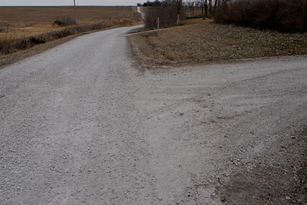 |  | This is the circle exit from the top of the rise looking at the road: nice and smooth with a lovely topping of gravel where it needed it. The dark gravel near the bottom of this image is just 'dirty', a nice rain with move that dirt. |