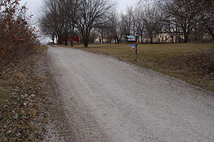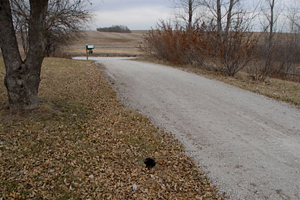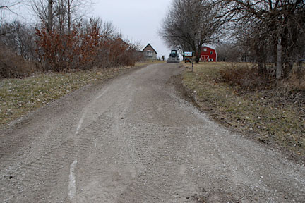 |  | The image at left shows the delivered gravel the way the dump truck was used to distribute it. I'm not sure if you can see it, but there was more gravel distributed on this side of the mailbox creating a 'bump' on the road and therefore a steeper pitch to the drive coming directly off the road. It's not more than a couple of inches difference, but it ended up being just enough that when we have snow, none of our cars can make the turn and climb that new angle. You can also see at the left side of the gravel driveway where the disturbed soil/grass is indicating the location of the drainage tube. |