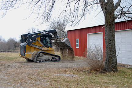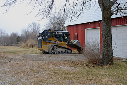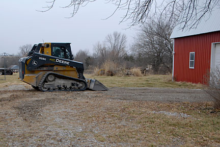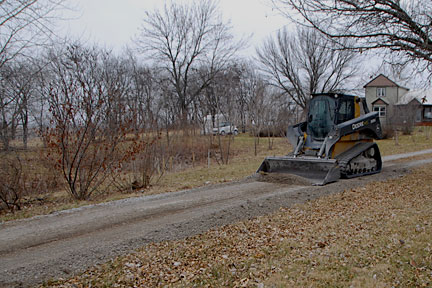|  | After he finished correcting the grade of the main driveway, he used what he had accumulated in his bucket to top dress the portion between the crab apple and the road. He had already taken several loads up to the garage and top dressed the parking area in front of doors. |