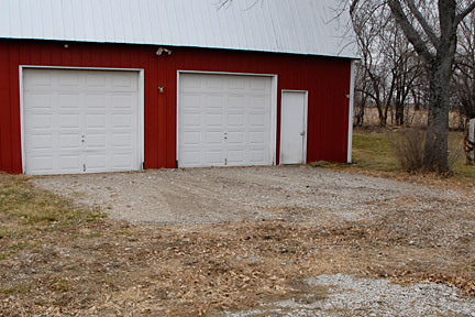 |  | There was no grading needed at the garage. Instead Tyler was distributing the gravel over the area in front of the doors as a top dressing to the 2" gravel that had been needed for the french drains. In this image he has already applied gravel to the nearer area and is working on the area in front of the further door. |