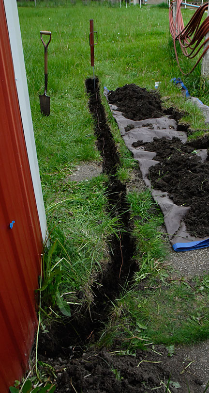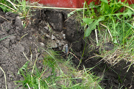 Above is the trench with the copper ground wire. Hubby used a tarp to contain the grass and soil during the procedure so it could be replaced easily and with no obvious signs of it ever having been disturbed. |
