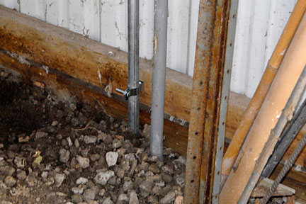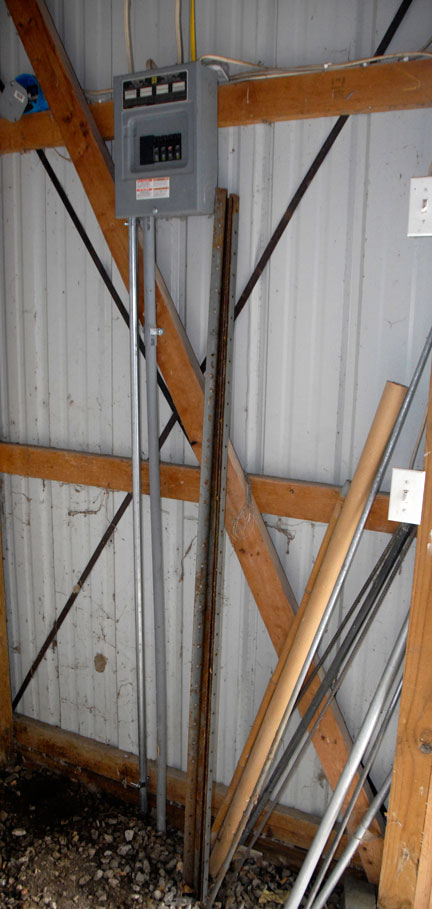 The image above is where the new metal conduit tube goes under the gravel so it can enter the trench outside. At left is the service panel all the way to where both the wire comes in under the ag panel wall (in the pvc conduit tubing) and the ground goes out (metal conduit tubing).   |
