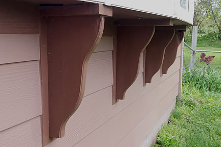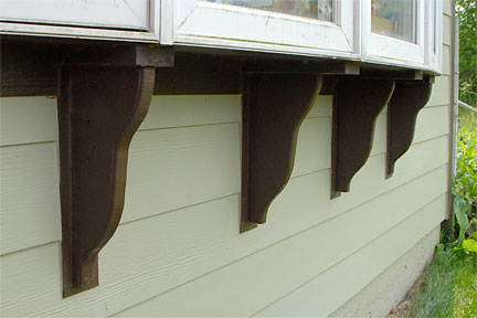 |  | And finally, the decorative corbels under the bow window. The top image is BEFORE and the bottome image is AFTER. Forest (the senior crew member) did a fantastic job recreating the two outer corbels that had rotted because the original owner had not set them back from the edge of the window; meaning water constantly ran down the window and onto the corbels.  As I look at the images, it's not as obvious as I would like it to be, but basically the replacements are about 1.5 inches shorter depth-wise so they are sheltered from the edge.  You are looking for the shape against the wall edge where it attaches to the backing board. The center ones stick out more at the bottom of each corbel. The new outer ones are therefore set back at the top. |