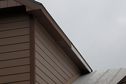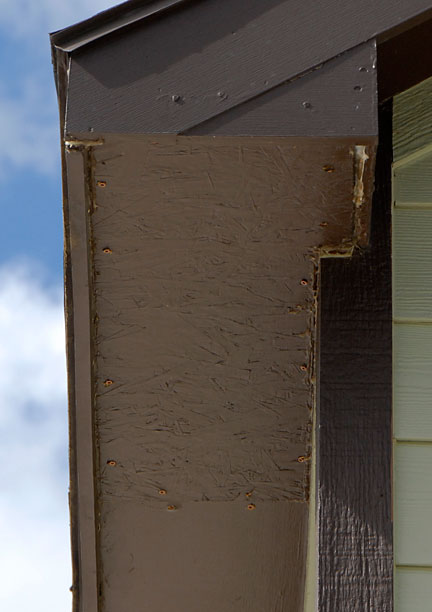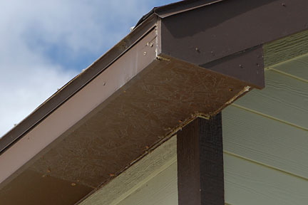 |  | The image at left shows the area at the north end of the replacement board.  It appears that the rest of the soffit is possibly not plywood but MSB like the repair crew used. I would hazard to guess that there is less water damage because the MSB isn't infiltrated due to the correct "drip edge" of the fascia board and the caulk and paint on the siding. |