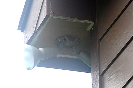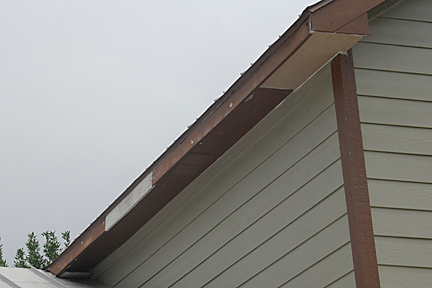 |  | Same issue on the corners of the top two (2) images even though they don't have floodlights. On the middle and lower images you can see the fascia boards that came loose/broke from wind vibration. These are both on the west side of the 2nd story.  Strangely enough, the corner on the lower image did not have any repair needed even though it is configured the same as the rest of the corners. |