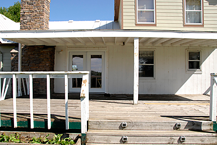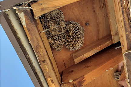 |  | The next image at left shows the same location in the summer of 2024. The MSB has warped and the glue/caulk has pulled away at the southern area. In this image you can just about see one wasp walking to or from the opening along the east side of that board. I had noticed this problem in the previous year but we had not been able to address it at that time. There were often blue hornets and paperwasps buzzing in and out in large numbers. Nice for the insects, not so nice for us humans. |