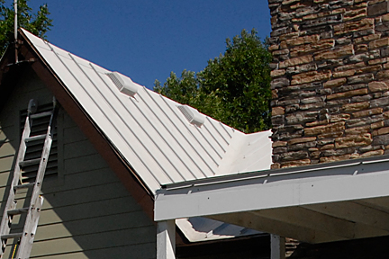 |  | These two image show the roof AFTER it had been cleaned. The guys had harnesses and a ladder that hooked over the peak so they always had a secure place from which to work. One basically worked the pressure washer while the other weighted the ladder as a counter balance type of thing. They were so quick, I never seemed to get out there in time to take pictures of them in the process. And when I did see them, I was so fascinated that I forgot to go get the camera. The images also show the new fascia board along the roof of the porch. I decided not to show you what it looked like before... actually, I decided not to show you ANY "before" shots of the spots that needed repair. All the rest of the images are AFTER pics.. There are even better pics of the clean roof on the 2020 Painting page. |