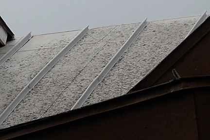 |  | It was difficult to get pictures of the roof without being up at roof level. These two (2) images are a fair representation of what the lichen growth on the roof looked like. The top image is the north side of the center roof. The peak runs east to west. That means this side of the roof is NOT in direct sunlight most of the time. It turns out lichen LIKES shade. The lower image is the south side of the center roof. There is a peak going north to south just behind the chimney to divert water away from the chimney. You can see how much less lichen there is because it gets full sunshine except for when the chimney's shadow is across it. The east gable (the 2nd story side, peak runs north to south) had minimal lichen because it is rarely in shade. The west gable (the ground floor side, peak runs north to south) had minimal lichen on the east side and a great deal of lichen on the west side because there are trees to the west of the house that shade it most of the day. |