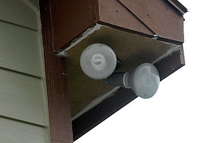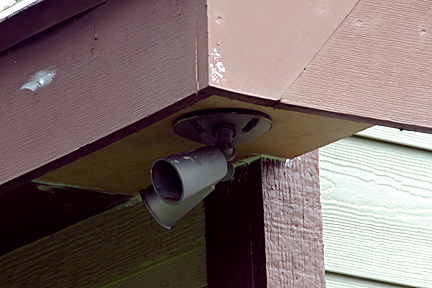|  | These three (3) image show  the floodlights on the corners. I suppose these areas rotted out because the fascia boards don't extend below the soffit on all sides. Because they are even on at least one side, the water can follow along the bottom of the fascia directly into the soffit. You can see the difference of the fascia boards on the top image. I'm sure the reason the original fascia boards are not deeper has to do with not blocking the lights. Not the best design... something we will have to keep an eye on. Also, because these corners had rotted, various types of wasps had made their homes inside the soffits. Thankfully, the hubby is a beekeeper and we have several beekeeper jackets/veils that the crew used to spray the areas before they went about their repairs. We don't like to kill things here, but there is a time and place to do so and we needed to make sure that no humans were stung during these repairs. |