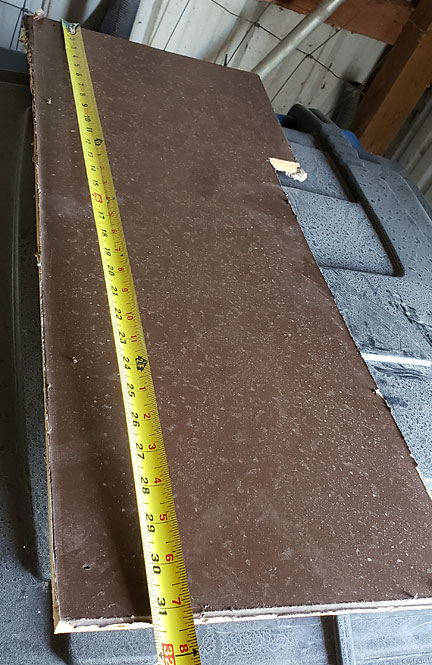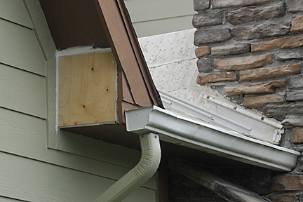 |  | Once the hubby removed the board, he took measurements all over it so that he could create a replacement in plywood. He also measured the opening once all the debris/caulk/etc. was removed and made sure the measurements of the new board were correct. We painted all the sides/edges of the replacement board to minimize water infiltration as much as possible. (No photos of that, sorry, but paint drying really is boring.) The plywood board surface has texture unlike the MSB shown. It may not match the rest of the soffit perfectly, but I'd rather a stronger, functional material over matching the rest. There was a great deal of prep required to putting the new board in place. Something the original crew should have done and we suspect all of their repairs DO NOT HAVE. Firstly, after cutting away all the debris/caulk/etc. the hubby used screws to resecure the warped Azek fascia boards to the structural boards. He then used scraps of 2x4 lumber to create attaching points... let's see if I can describe this since I don't have pictures.