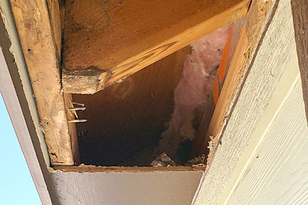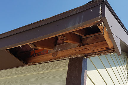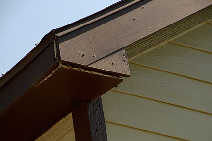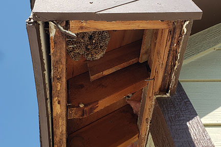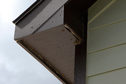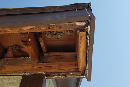 |  | This second image shows the water damage along the east edge... the part that extends beyond the wall. This comes from water traveling down the vertical east board to the board that had abutted it. (No drip edge provided.) You can also  see the wasp nests; both paperwasps and mud daubers in the images below left and right. In these same images, you can see how the Azek board fascias DO warp and shrink (even though they are advertised to do neither). The nails that are visible are where the Azek fascias were attached to the structural roof boards. |
