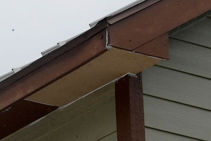 |  | The image at left shows the repair job done in 2020 at this location (southwest corner of the east gable). The crew replaced the damaged soffit with MSB instead of plywood. It looks fine, but there are no nails or screws securing it in place. They used what appears to be a wood glue and/or caulk to keep in in place. |