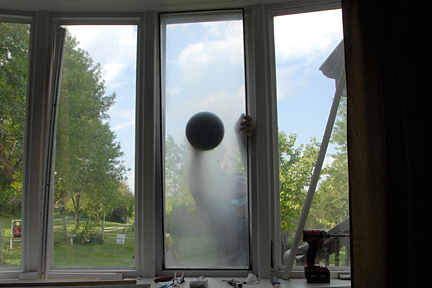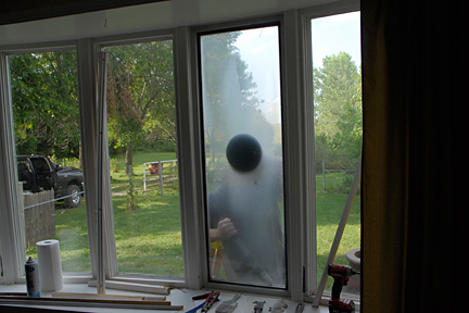 |  | I'm out of practice and forgot to have my camera at hand when Robie arrived, so you aren't being subjected to a bunch of boring pictures this time. LOL In this photo, you see Robie has finished removing the interior stops and has moved on to cutting the seal around the window pane on the outside. It turns out (and I did not know this) that the exterior side of this bow window is vinyl and a solid construction. So the panes themselves are installed from the interior side with a sealant between the pane and the exterior vinyl. You can also see just how bad the condensation is in this window pane. |