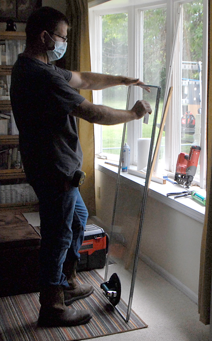 |  | In the process of removing the pane, he was able to determine WHY there was condensation and water damage to the interior bottom stop. Not only had the wrong type of sealant been used but the old pane had been a wrong-size replacement! There was a 1/4 to 1/2 inch gap on the left side (as seen from the inside).  I was not surprised. This was the window pane that had condensation in it when we were buying the house and the previous owner had to have it repaired as part of the purchase deal. He obviously used a cheap pane and didn't care that it wasn't the correct size held in place with the wrong sealant. Ugh. After removing the old pane, Robie was meticulous in cleaning the entire opening and all the pieces that he would be putting back in with the new pane. He has this great little portable shop-vac that I was lusting over, LOL. (You can see it in the photo at left by his feet.) Then it was a matter of removing the sticker (as you see at left), applying the sealant to the outside edge of the new pane and maneuvering it into the opening before replacing the inside stops. I was impressed that he simply cut off the nails in the stops so he could nail them without trying to fit the old nails into their former holes. (Yes, little things do impress me. LOL) He was also successful in shifting the undamaged top stop to the bottom and the damaged bottom stop to the top. All I had to do was add a little wood glue filler several days later. Once I paint it, I won't even notice it. After he finished inside, he went outside and cleaned off the excess sealant. Then he cleaned both sides of the window so well that I had to clean the other windows to feel less ashamed of myself for letting them become so dirty, LOL. |